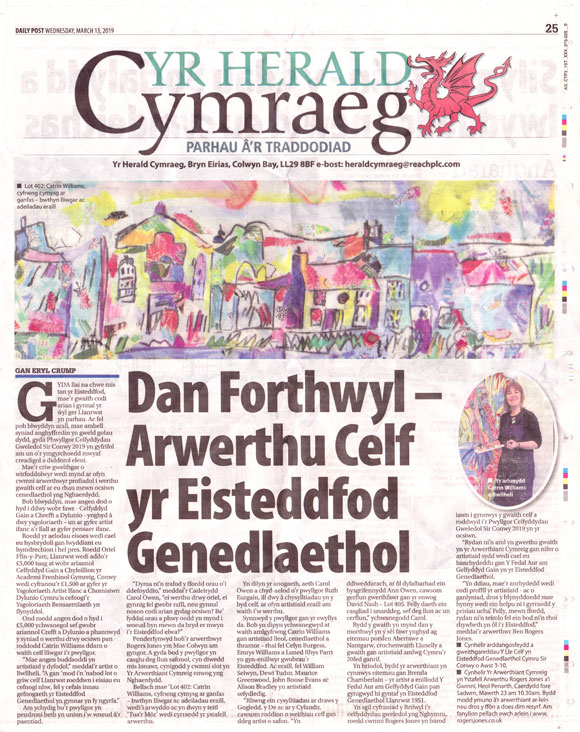 Yn sgil cyfraniad y Brifwyl i’r celfyddydau gweledol yng Nghymru, roedd cwmni Rogers Jones yn barod iawn i gynnwys y gwaith celf a roddwyd i’r Pwyllgor Celfyddydau Gweledol Sir Conwy 2019 yn yr ocsiwn.